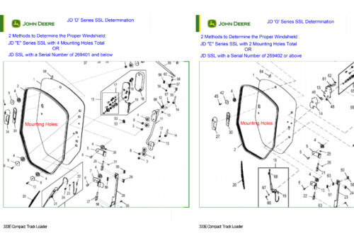 John Deere Windshield: Skid Steer D & E Series- offered in 1/4", 3/8" & 1/2" Replaces OEM Glass#T312628 Includes models 318D, 319D, 320D, 323D, 326D, 328D, 329D, 332D & 333D. **There is a SERIAL BREAK in the E series. Serial #'s 269401 and below are D WINDOWS than serial #269402 and above are G WINDOWS. See photo for reference on mounting holes. CLEAR POLYCARBONATE - SUPERCOAT™ BOTH SIDES. FORM ~ FIT ~ FUNCTION of OEM glass with every thickness - no extra hardware needed! Lead times, install videos & more in description! -